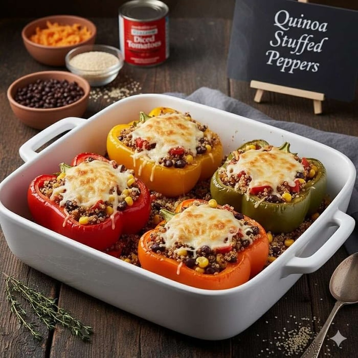 Colourful peppers filled with protein-rich quinoa and seasonal vegetables for a wholesome vegetarian meal.