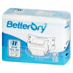 BetterDry Overnight Adult Diapers with Plastic Backing deliver reliable, heavy-duty protection designed for individuals managing significant urinary and fecal incontinence. These diapers feature an extra-thick padded core that efficiently locks away moisture, reducing the risk of leaks and skin irritation. The smooth, durable plastic backing provides a waterproof barrier while remaining discreet under clothing. High-standing leg cuffs and elastic waistbands in both front and rear help create a snug fit, preventing side leaks during movement or extended wear. Refastenable tabs allow for easy adjustments to achieve maximum comfort. The integrated wetness indicator changes color to signal when it is time for a change, helping maintain skin health and hygiene. These diapers are praised for their superior absorbency and durability, making them a dependable choice for both daytime and overnight use.