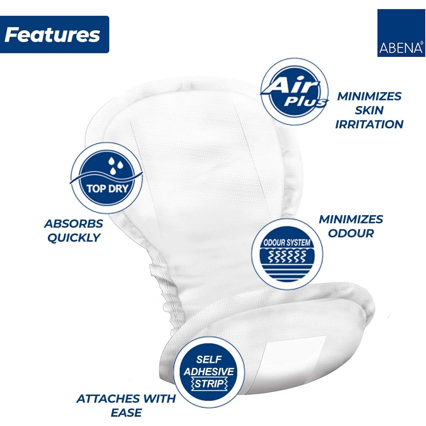 Abena Maternity Pads cover light to moderate incontinence. The product offers a unique protection against leakage with super soft and flat lengthwise barriers. It can be fixed via the use of the self-adhesive strips on the back of the pad. It has Abena’s Top Dry system, that allows the user to feel dry and comfortable, while letting the skin breathe.