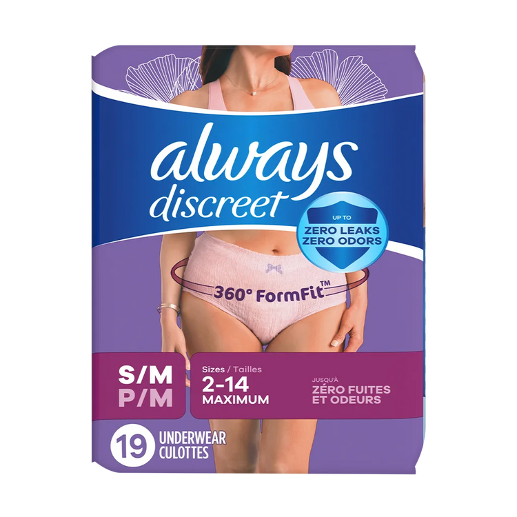 The exclusive OdorLock Technology works instantly and continuously to neutralize odors, promoting a dry and confident feel throughout the day. Additionally, the specialized side LeakGuard design targets leaks at the legs, where they are most likely to occur. Rely on the incredible protection of Always Discreet Incontinence Underwear, available in sizes S/M – XXL, thoughtfully designed to accommodate various body shapes. Unexpected leaks become a thing of the past, allowing you to stay fresh and dry as you navigate your daily activities. With Always Discreet incontinence underwear, you can trust that you're receiving the protection you truly deserve.