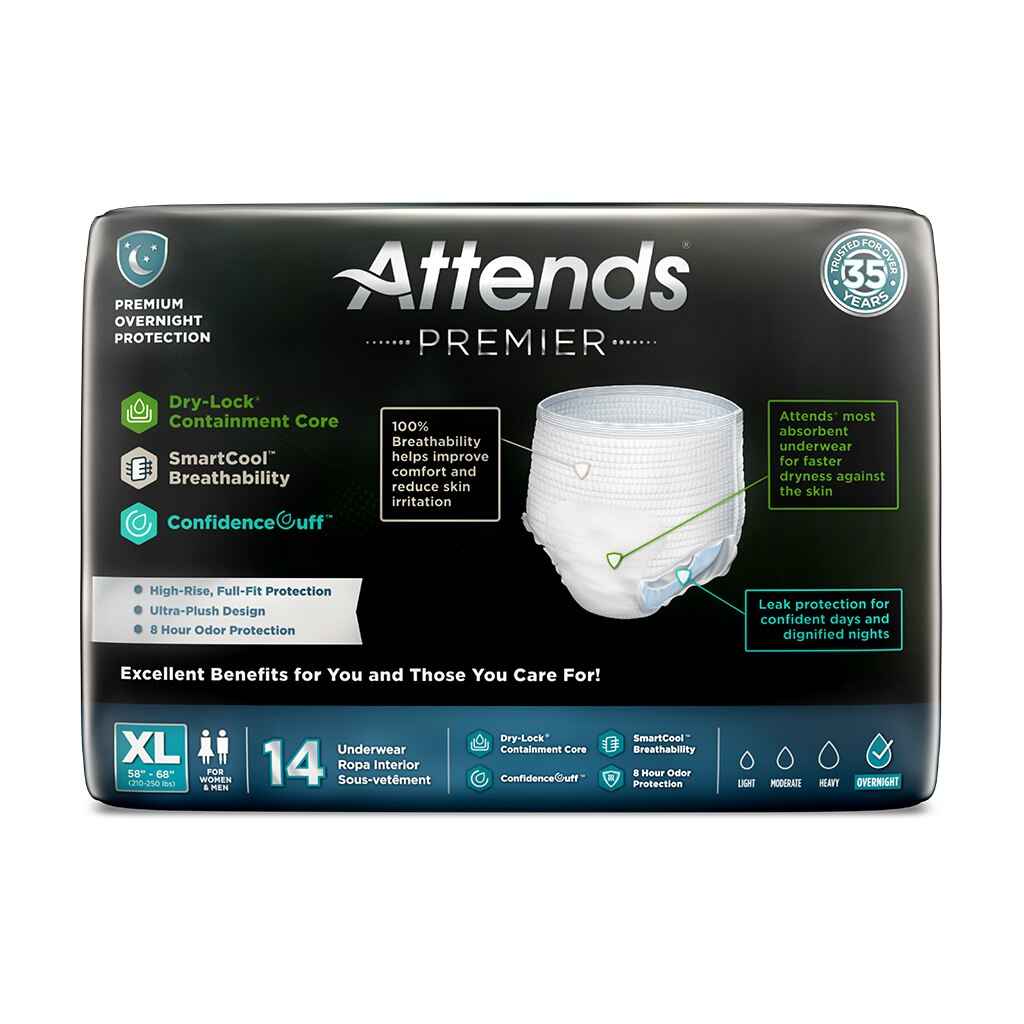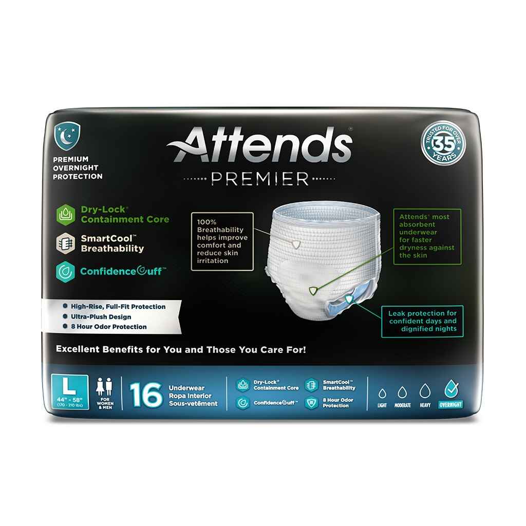 Attends Premier Pull Up Absorbent Underwear is a premium product that offers the ultimate protection and comfort for people with heavy to severe incontinence. The underwear is super-absorbent and with a capacity of over a liter (34 oz.), it’s perfect for a full day out or for overnight use. Thanks to the high absorbency, it’s also perfectly suitable for fecal incontinence.