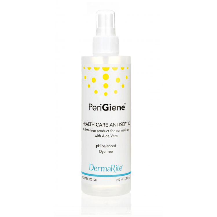 DermaRite PeriGiene® Rinse-Free Perineal Antiseptic Cleanser is a carefully formulated perineal wash spray designed to cleanse, disinfect, and deodorize without requiring rinsing. The cleanser uses an antimicrobial active ingredient, chloroxylenol (PCMX) at 0.5% strength, which helps kill bacteria on contact and reduce risk of infections.