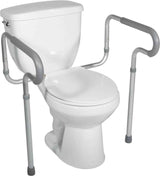 This sturdy and lightweight toilet safety frame by Drive Medical provides your customer with Waterfall armrests which provide additional comfort and support. Powder coated aluminum brackets which easily attaches the frame to toilet. The Arms are height and width adjustable conform to you.