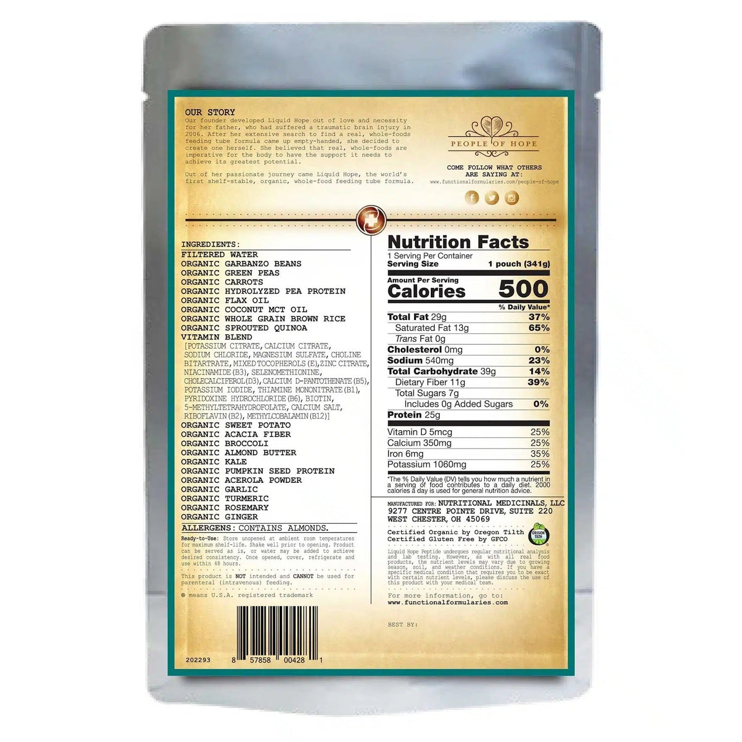 Liquid Hope Peptide is the first organic, whole-food, plant-based peptide formula designed for feeding tubes and meal replacement, specifically optimized for adults. This innovative formula builds on the original Liquid Hope by incorporating organic hydrolyzed pea peptide protein and organic coconut MCT oil. Each serving delivers 500 calories from 19 Certified Organic, whole-food, plant-based ingredients, carefully crafted to promote enhanced digestion and optimal nourishment.