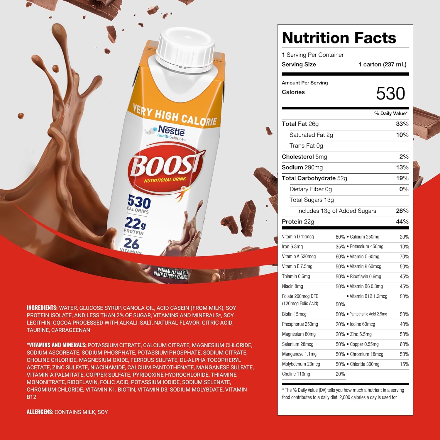 This Boost nutritional drink provides 530 calories per 8 fl oz serving, 22 grams of protein, and 26 vitamins and minerals. Appropriate for fluid-restricted diets and increased calorie and protein needs. Available in Chocolate, Very Vanilla, and Strawberry flavors. Best if served chilled.