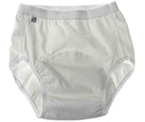 Cotton incontinence pants with a sewn-in, leak-proof, polyurethane (PUL) fabric barrier, and leg bands that are water-repellent. Designed for both men and women.