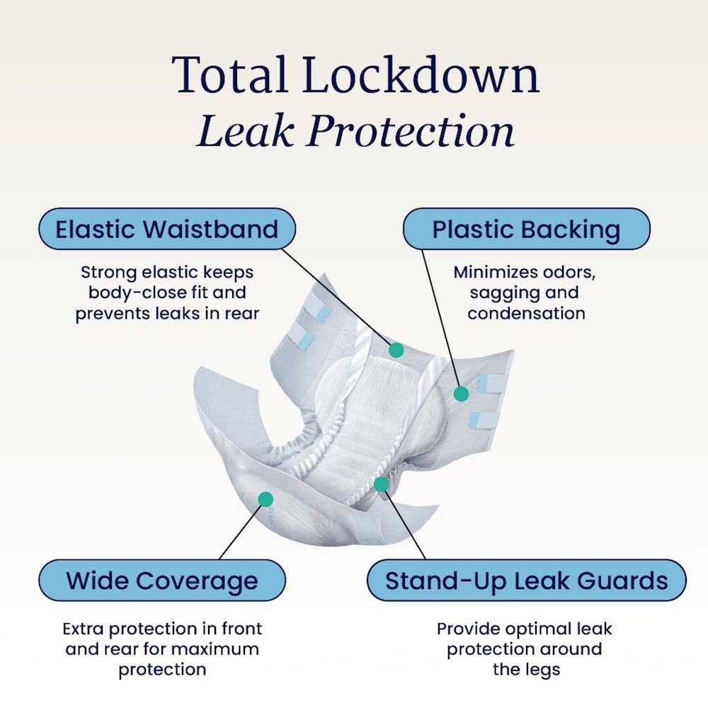As experts in incontinence solutions, we've crafted our own premium brand to match the extensive front and back coverage of European-style diapers. Our top-tier, plastic-backed briefs offer world-class absorbency at an affordable price. The unique Microsorb lining remains soft and dry throughout the night, and the tall Leak Guards provide unparalleled side leak protection, even for side sleepers. Simply activate the brief, and the leak guards will stand up, ready to absorb. Plus, they're latex-free and proudly made in the EU.
