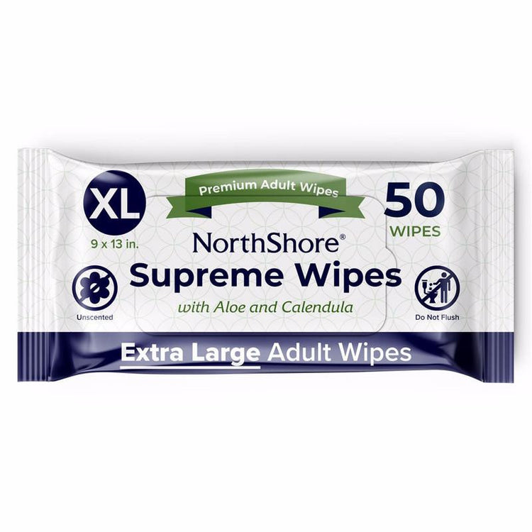 NorthShore Supreme Quilted Cleansing Wipes are extra-large, durable adult wipes designed for full-body cleansing when soap and water aren’t available. Each wipe measures 9" × 13", offering generous surface coverage—about 50% larger than standard baby wipes. A smaller 7” x 8” size is also available for more localized cleaning needs.