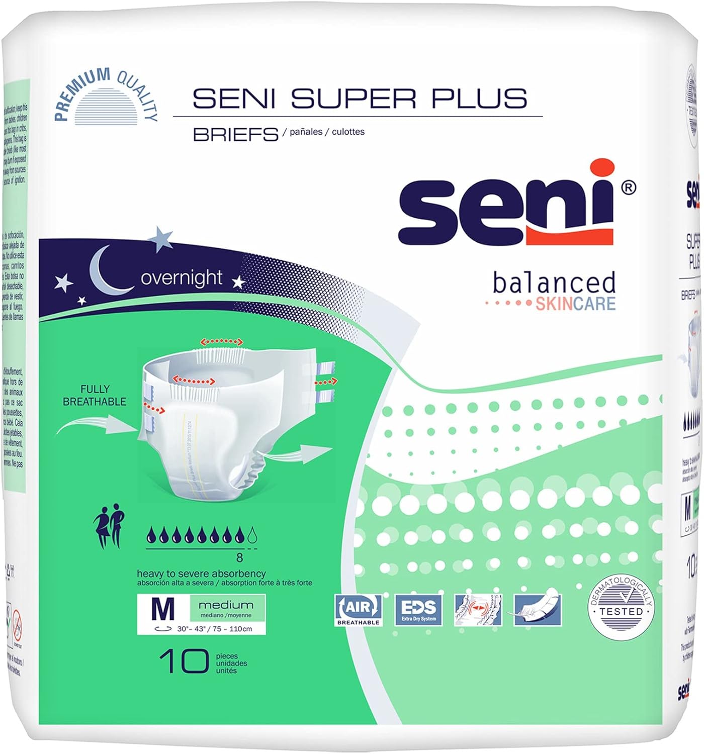 The core of the Seni Super Plus features a double absorbent system that quickly locks away moisture, keeping the surface dry against the skin. This technology is paired with built-in odor control to neutralize ammonia, ensuring freshness throughout the day or night. With a focus on a "perfect fit," these briefs include elastic waistbands and double-elastic combi-tapes that allow for multiple adjustments without tearing the outer layer. This flexibility ensures the brief stays in place during movement, offering a leak-proof experience for active users or those in bedrest.
