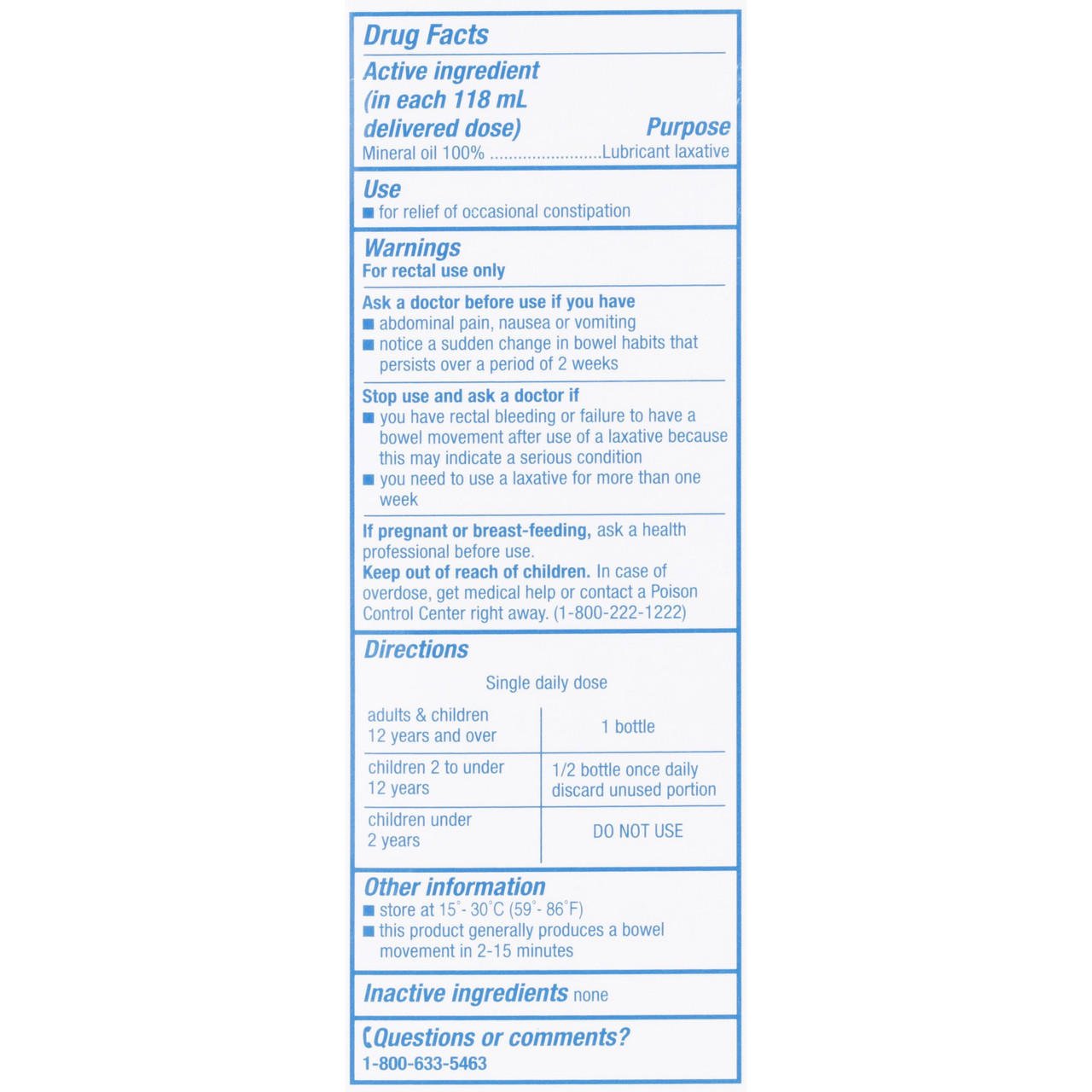 Always follow directions for use. Consult your doctor if you have any questions regarding whether you should rely on a mineral oil enema. Discontinue use immediately if you feel pain or discomfort or if you encounter rectal bleeding.