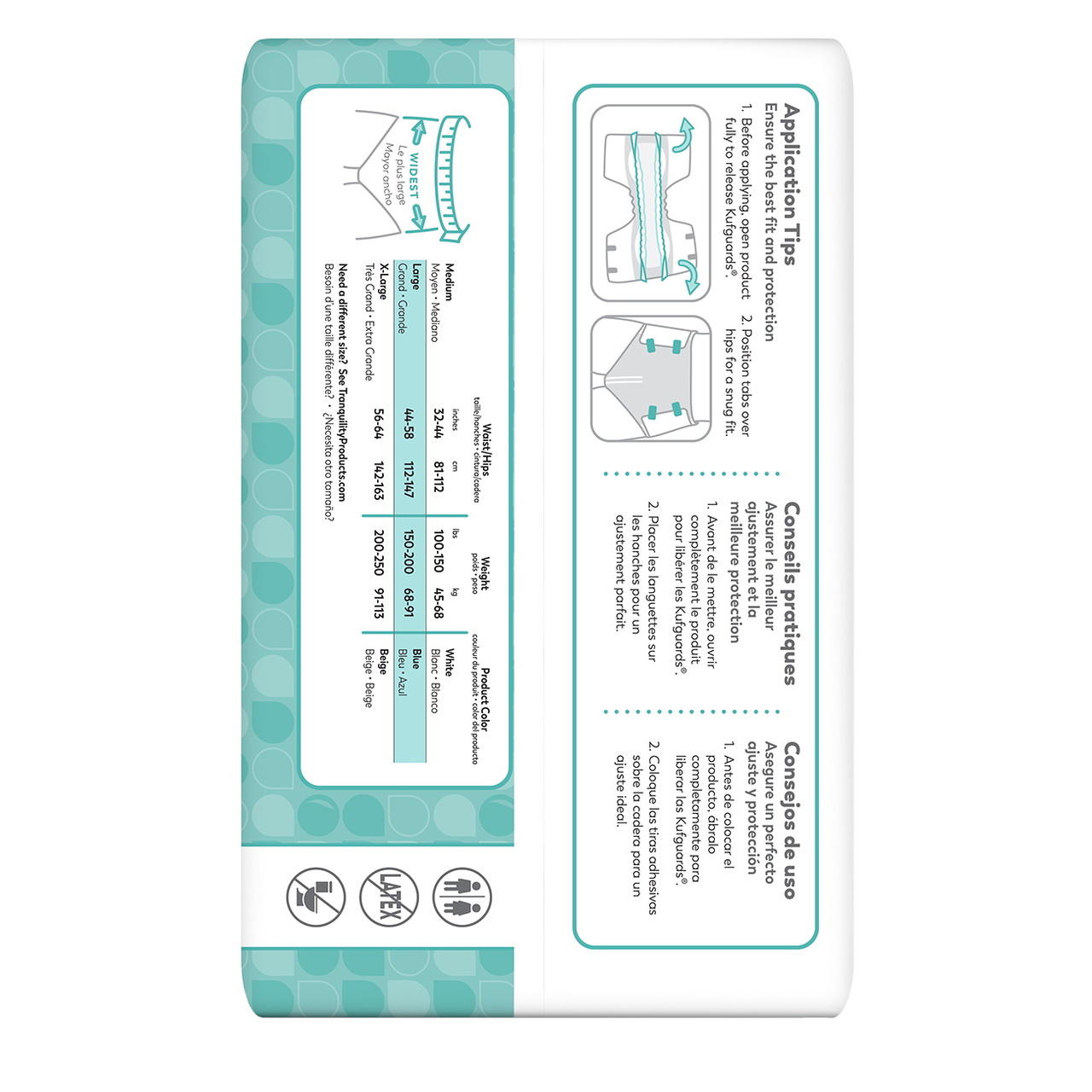 Tranquility® Essential Breathable Briefs are a soft and breathable tab-style product offering secure protection where you need it. These briefs feature breathable side panels and refastenable tabs for a comfortable fit. Kufguards® channel and lock in fluid to keep you dry. Recommended for individuals with heavy incontinence. Latex-free.