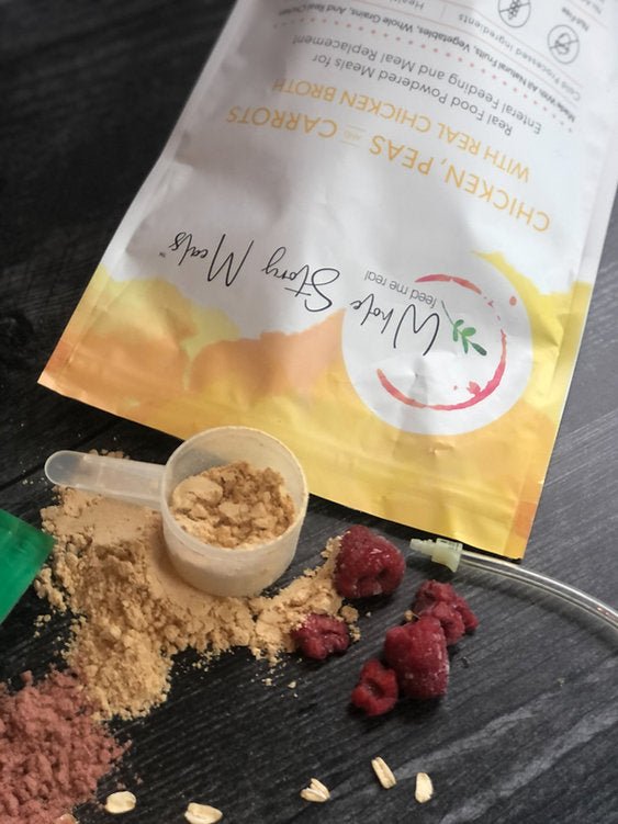 Whole Story Meals Chicken, Peas and Carrots Flavor Powder Oral Supplement is a complete powdered real-food meal formulated for both oral consumption and enteral (tube feeding) use. Designed as a nutrient-dense option, it must be rehydrated with a suitable liquid, such as water, juice, milk, or a milk alternative, before use. The product comes in a 16-ounce resealable pouch and yields a prepared one-cup serving containing approximately 400 calories, comparable to other balanced meal replacement products.